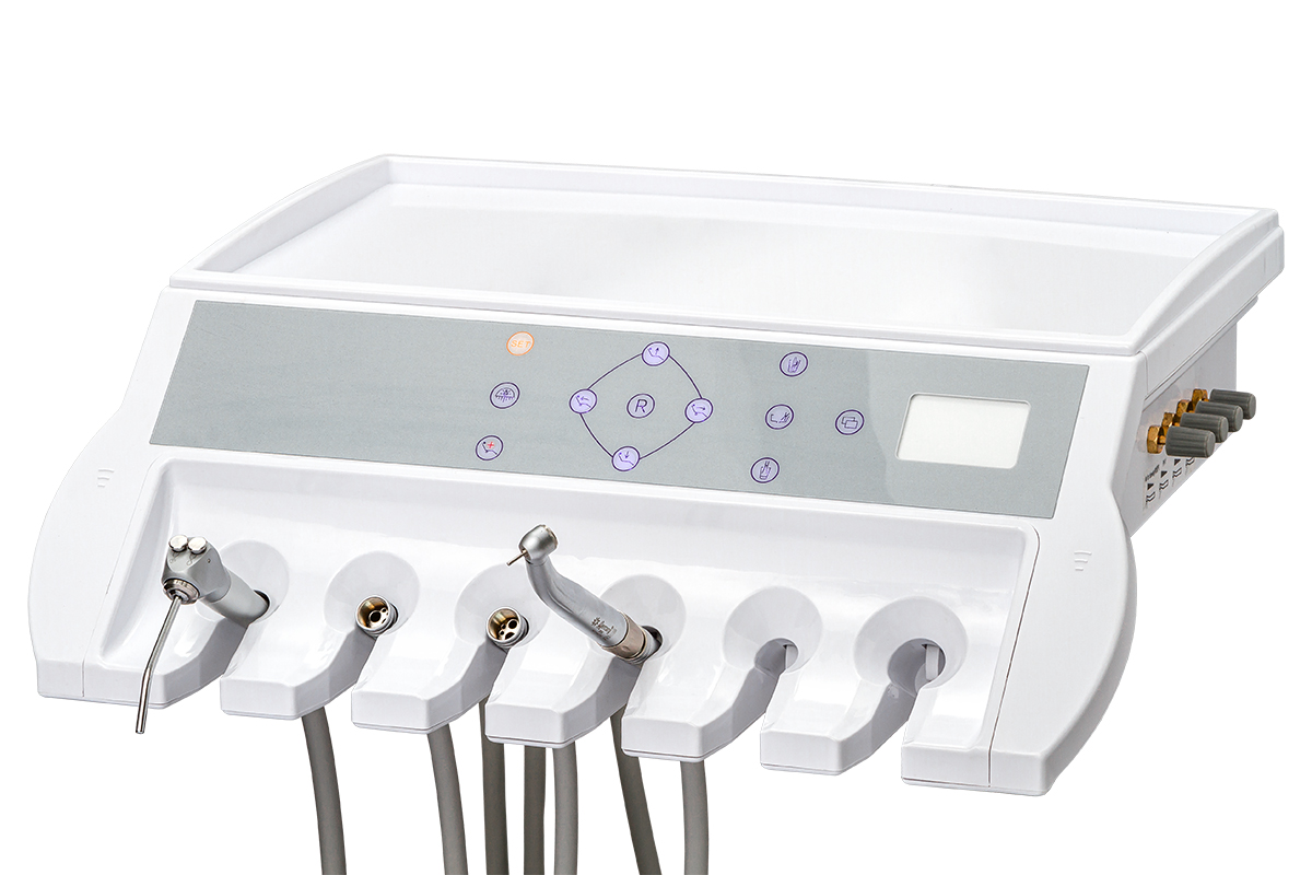 - Блок врача рассчитан на 5 инструментов, три из которых уже оснащены турбинными шлангами М4, а 1 слот оставлен под встраиваемый микромотор или скейлер — вы сами решаете, как расширять функционал.